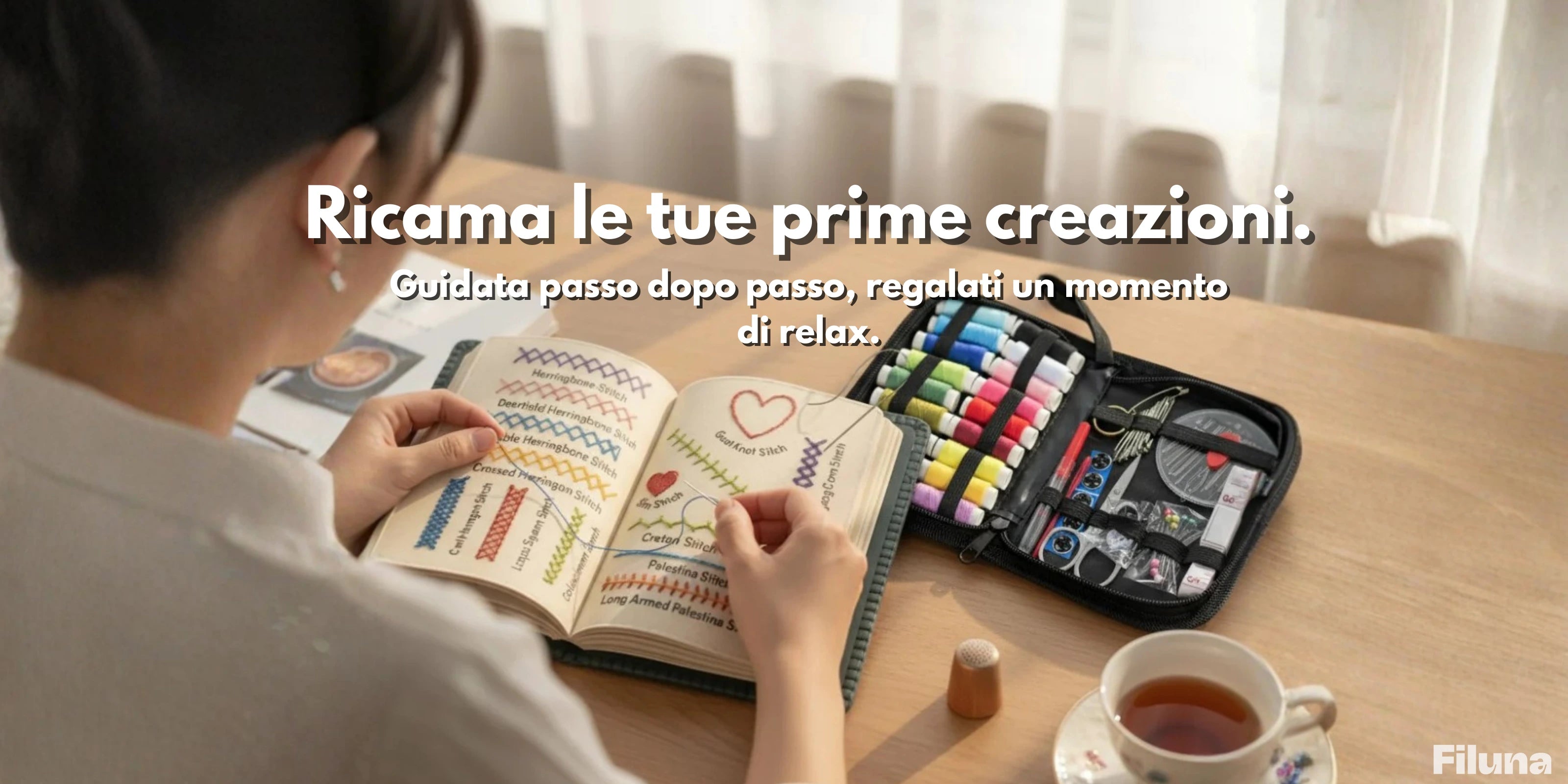 FILUNA è un libro di ricamo guidato: ogni pagina ti mostra un punto, un gesto, un’ispirazione e ti invita a riprodurli al tuo ritmo.